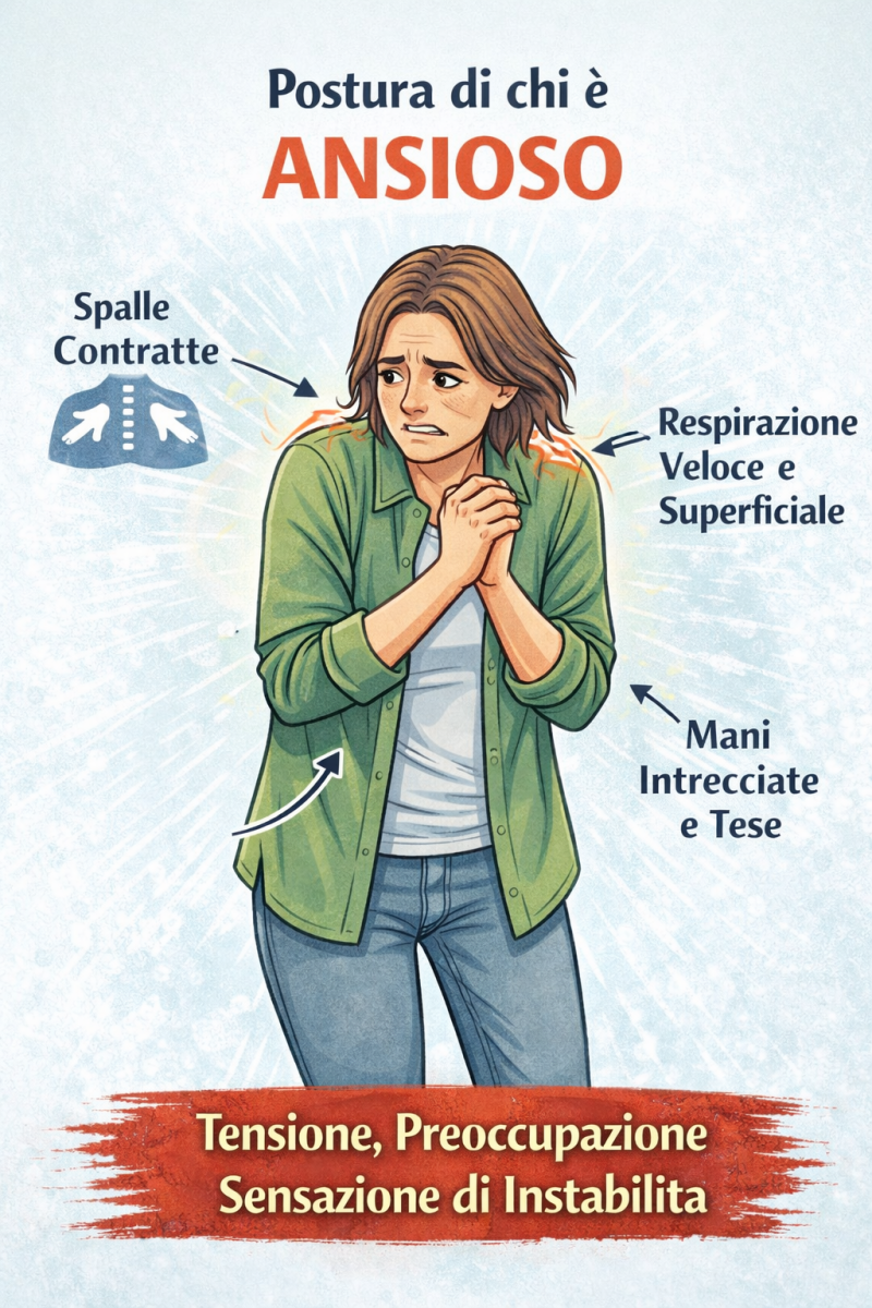Lo stress provoca tensioni muscolari di collo, spalle, chiusura toracica e contrattura del diaframma , causando una postura in chiusura .